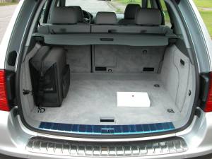 Cayenne後座折收方式與常見SUV相去不遠,必須先將座墊向前拉出後再行折疊,隨後再將頭枕拔除後,才能把後椅背放平,有趣的是後椅背背部有個防護隔網,無論後座是否折疊,都可以用來防止行李往前滑動,而後座椅變化的操作裝置手感非常細緻,行李箱淨空後,底部與側邊全都鋪設了軟質地毯以防止行李碰撞或刮傷。
