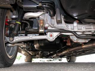 EVO前懸吊仍是麥花臣設計,只是上座多了粗壯的上拉桿,防傾桿當然也是調校強化過的;後懸吊幾何結構和一般的Lancer不同,並多了粗壯的副樑及傳動機構,懸吊材質是輕量化的鋁合金,排除EVO的動力因子,光操控性能就有百萬身價!這一點也不誇張。避震器行程長,過彎時側傾也不小,但阻尼調的相當硬,硬到在一般道路行駛都會有跳動、顛簸的不適,並不符合房車舒適的條件,但真的遇到大坑洞及大起伏時又不會劇烈彈跳或晃動,側傾雖大,但不會飄浮難以操控。強大的煞車性能亦是EVO征服山路的一大本錢,以往下坡衝刺都會覺得一般市售車的煞車不敷使用,但EVO不但沒有煞車過熱問題,入彎前也沒有頻頻讓車輪鎖死、ABS作動,輪胎固然好,但煞車中並未使用全力制動,EVO的操控極限是相當高的!