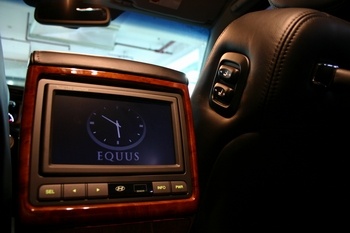 穩定與舒適在Equus上算是相當的協調,而且韓國頂級房車的配備不算差,例如國內當下頗為流行的影音系統,Equus上不只前座中控台上配有螢幕,中央扶手本身就是個基座,不僅可以打開並且置物,原廠還在中央扶手上設立了一個7吋LCD螢幕供後座乘客使用,而且只要變速箱排入檔位並放掉手煞車,前座LCD螢幕便自動停止播放,此刻後座螢幕仍會繼續播放。除了雙螢幕,Equus還有輸入影音等功能,掀開後座中央扶手面板,就可看見內藏的影音訊號輸入端子,只要將外接設備訊號線接上即可使用。