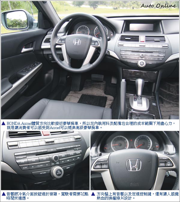 內裝配備質感我最豪華 運動豪華難取捨![]() 三部車中進入座艙第一眼感覺最豪華的是Accord,在這項目中名正言順得到最高分數41分,編輯們都認為Accord體質方向比較接近豪華房車,所以在內裝用料及配備在合理的成本範圍下用盡心力,就是讓消費者可以感受到Accord可以媲美高級豪華房車。層次分明的設計概念也是HONDA最具特設內裝設計之一,充滿舒適風雅的內裝質感也是三車中最佳,不論是在視覺或者觸覺上都是最好表現。電動座椅、後窗遮陽簾、音響快撥鍵、核桃木飾板這類豪華房車上才會出現的配備Accord都有,唯一缺點是沒有配置先進的多媒體整合系統,冷氣空調、音響按鍵太過複雜,駕駛者需要一點時間適應。