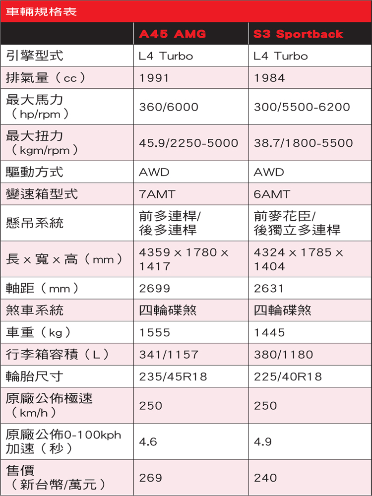 戰鬥指數爆表又如何?![]() ▲縱使馬力相差有段差距,卻是目前國內四驅鋼砲中,性能最接近的同級距對手。在AUDI尚未推出本世代的RS3 Sportback之前,S3 Sportback只能硬著頭皮和A45 AMG正面對決,但也先別預設立場認為這是一場註定贏不了的戰爭,至少從帳面數據看起來,差距似乎並沒有想像中來得大。