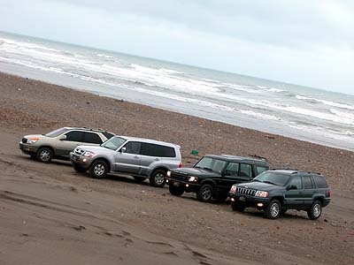 JEEP Grand Cherokee 4.0、BUICK Rendezvous 3.4、LAND ROVER Discovery 4.0、MITSUBISHI Pajero 3.5。兩百萬預算內SUV有啥好料可選?比較後才發現此級距「臥虎藏龍」。多數人只注意到國產SUV之爭,這不外乎CR-V、Escape、Tribute、X-Trail、Grand Vitara互砍,不然就是眼光放在最高點,看看Cayenne、X5、M-Class、Allroad Quattro、Range Rover等金字塔頂端勁車廝殺一定很過癮…。其實越野車這東西真的很有趣,花400萬買部M-BENZ G500別以為它天下無敵,若不懂越野調校及改裝,原廠設定到了墾丁九棚沙漠將慘遭滑鐵盧頻頻受困,坡度太陡上不去、衝刺太慢會挖沙、橫渡太斜會撇車尾…,然後看到JEEP Wrangler、SUZUKI Escudo等百萬內中度改裝車如小蜜蜂般四處橫行。強龍不壓地頭蛇,來到別人的越野地盤,若不曉得些特殊「撇步」通常會吃鱉,這也是越野趣味及技術所在。越野和車體重量、軸距、車長…有密不可分的關係,大車在此特別吃虧,質地軟、起伏大的路面越重的車越難通過。