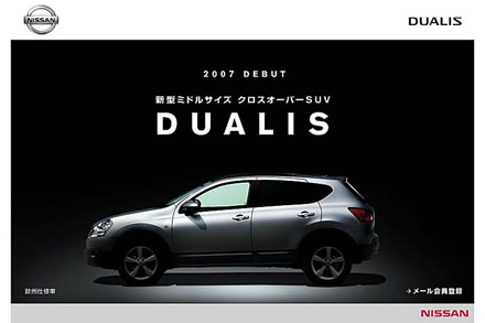 在日本國內,Dualis鎖定的對手是TOYOTA RAV4,為強化競爭籌碼,採用歐規所沒有的若是行車死角監視系統(Side Blind Monitor),外觀上也是走日本和風路線,與歐洲地區的車款各自表述。行銷策略方面,搭最近即將上映的Transformers變形金剛電影創意,廣告公司規劃一系列變種車視覺廣告,片中的機器人由日本著名動畫大師河森 正治所描繪,從7月1日起於國內巡迴展出以創造話題。