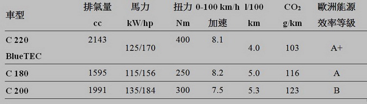 動力陣容部分,歐規車型在上市之初會有三個車型,入門的C180搭載1.6升直列四缸渦輪引擎,最大馬力156匹,C200車型搭載2.0升直列四缸引擎,可輸出18/4匹最大馬力,著重環保節能表現的C220 Bluetec車型則搭載2.2升直列四缸柴油渦輪引擎,可輸出170匹最大馬力。在油耗上最多比上一代節省了20%。未來還會陸續追加汽油、柴油引擎與混合動力等多種不同版本車型。