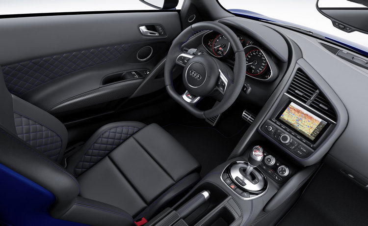 ![]() ▲車尾採用固定式尾翼,藉以提高後軸下壓力。外型方面,R8 LMX在前後及車側裙腳、擾流翼和引擎飾蓋等處使用碳纖製品,並採用固定式後尾翼提供後軸更大的下壓力,並配備19吋輪圈和紅色卡鉗、陶瓷碳纖煞車碟盤,同時提供專屬藍色、灰色與黑色車漆的選項。 ![]() ▲內裝同樣採用藍色作為主題顏色,與它的雷射技術相呼應。
