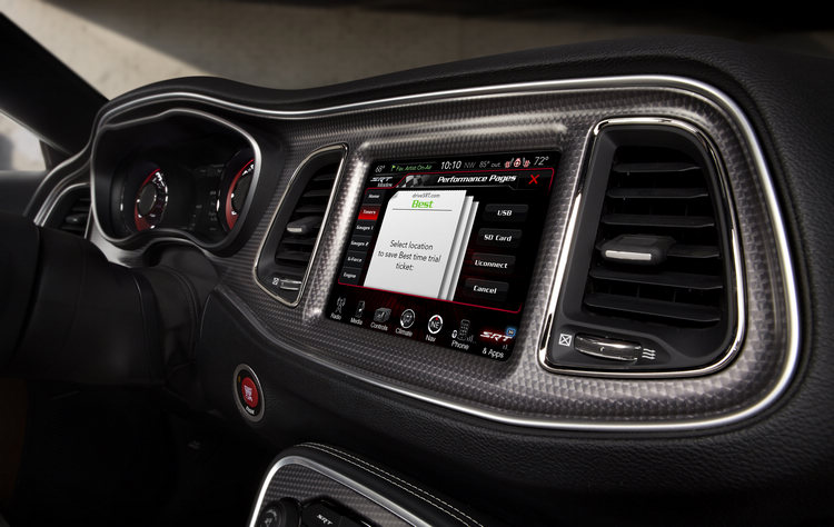 ![]() Challenger SRT Hellcat的輪圈使用七幅20吋鍛造鋁圈,搭配P275/40ZR20 Pirelli P Zero Nero輪胎,配合390mm碟盤與Brembo前六活塞卡鉗煞車系統,進一步強化它的制動性能。至於內部則有相當現代感的格局設計,譬如8.4吋觸控螢幕、皮革包覆和鋁質飾條,7吋駕駛儀表多功能顯示幕還能模擬1971年的Challenger。