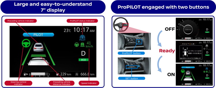 開車時,駕駛者只需要藉由方向盤的按鍵就可以啟動與設定ProPILOT,中控台螢幕會切換為系統運作狀態顯示。車上所配置的攝影機具影像處理機能,可以立即偵測判斷出道路前方車輛與白線等物體,迅速以所偵測到的訊息進行判斷並控制方向盤及油門、煞車,讓車輛與前車保持在所設定的距離並維持走在車道線之內。