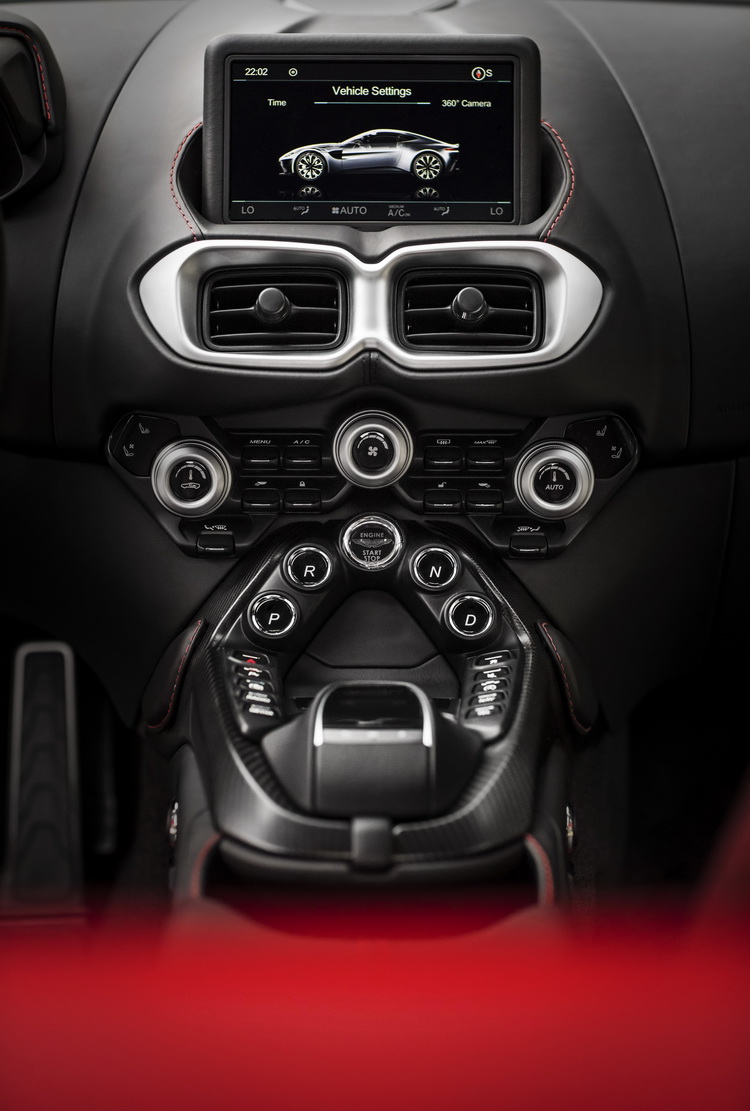 空力設計對於一部優秀的跑車來說是少不了的,新Vantage的前下擾流將車頭氣流導引至車體,透過車體有系統的格柵孔道設計將氣流分配至需要散熱的地方,並讓車尾擴流器獲得乾淨的氣流。擴流器在車尾產生低壓區,同時防止後輪產生的紊流去干擾到車底氣流向車尾後方排出的動線。車側的導氣孔可有效地將車頭內的氣壓從前輪拱處釋放掉,車尾如小鴨尾般的上翹則可產生極高的下壓力。