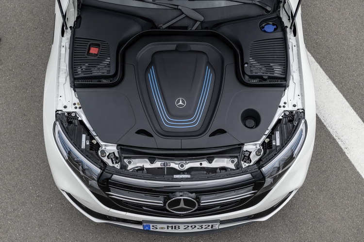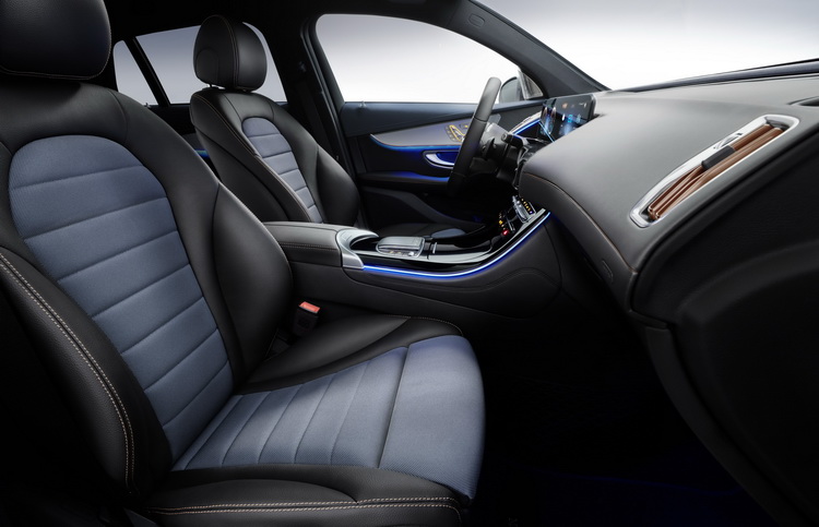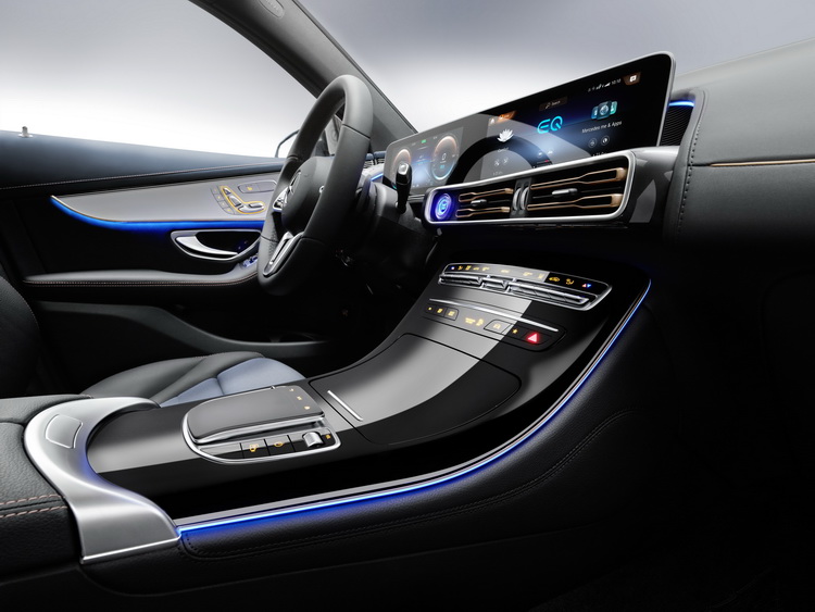 頗富肌肉感的車身搭配向後延伸的車頂與車窗輪廓線條,加上位置較低的腰線,讓EQC的外觀既是SUV卻也接近轎跑車,跨界風格十足。車頭以黑色飾板將大面積的水箱罩與跟 MULTIBEAM LED頭燈之間連結起來,給人強烈的視覺存在感。