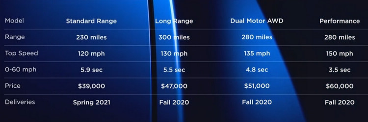![]() Model Y實際上底盤與Model 3相同,電池也可於超級充電站進行充電,包括最新第三代超級充電站的高效率充電模式都可相容。而根據Tesla公開的資料,這款車將會從明年Q3開始陸續推出性能版Performance、增程後驅版Long Range Rear-Wheel Drive、AWD版等車型,至於最便宜的標準版則會等到2021年初才會上市。