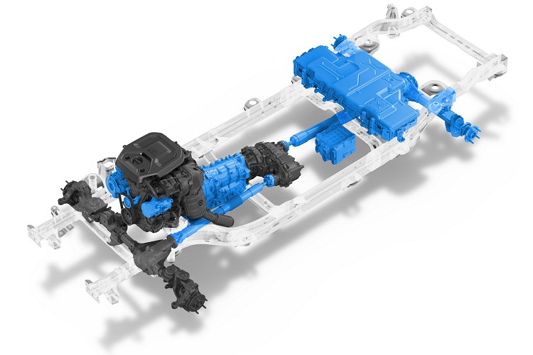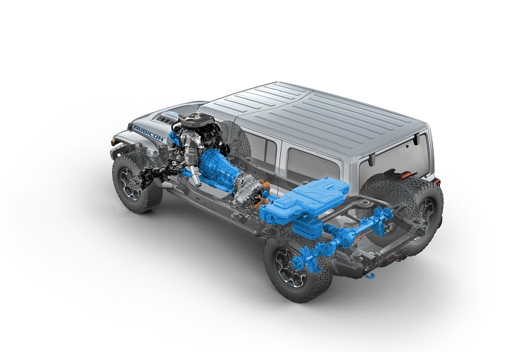Wrangler 4xe車型在粗獷的外表下藏著一具2.0升渦輪增壓引擎,會使用至少兩具的電動馬達與變速箱結合,高達17kWh的鋰離電池放置於後座底下。綜效馬力可達到380匹和637牛頓米最大扭力,這意味著Wrangler 4xe提供更大的動力輸出,甚至超越3.0升V6柴油引擎車款。