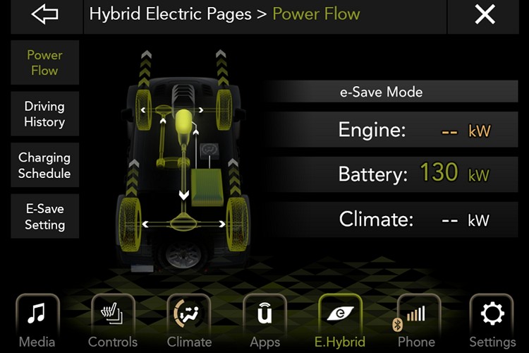 電池充滿電的情況下,4×4電動行駛可達到40公里,通過儀錶板左側的特殊行車模式切換按鈕,可選擇駕駛者想要的特性。特殊的行車模式有Hybrid、Electric與E-Save,Hybrid模式下電腦會自動切換電動與引擎的輸出,Electric顧名思義就是以純電模式行駛,最後一個E-Save模式下盡可能儲存電量以備後續使用,該模式下支援單踏板駕駛功能。