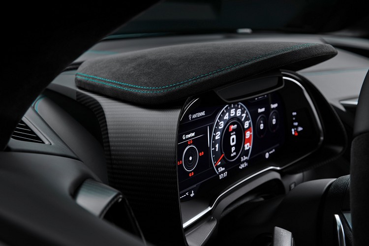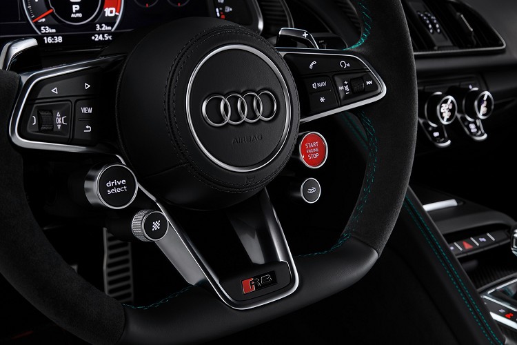 進入車內後,雙前座賽車座椅包覆著Alcantara麂皮,座椅股價為碳纖維材質減輕車身重量,皮質的拼接縫線上採用與車身同色的綠色,與車身顏色相互輝映。R8 Green Hell Edition特仕車在車內有特殊地墊、麂皮包覆賽車方向盤等,帶來有別於一般車型的差異。
