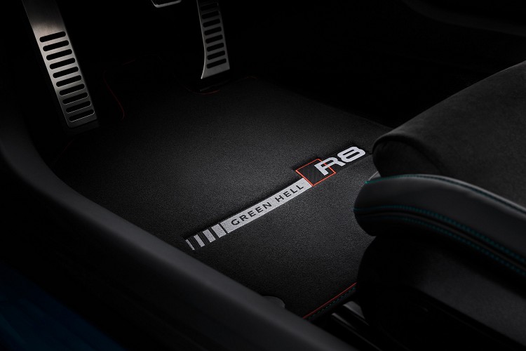 這輛R8 Green Hell Edition特仕車的靈感來自於Audi Sport Team #1運動團隊中號稱鳳凰的賽車塗裝,深綠色的特殊車漆帶來一種神祕感。當然如果客戶不喜歡綠色,也是可選擇白色或者黑色比較大眾化的顏色。但不管是哪種顏色,車頭水箱護罩、車頂以及A柱上都會施以消光黑色烤漆。