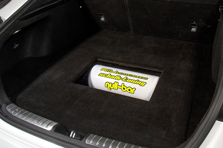底盤部分換上Bilstein推出的性能氣壓懸吊,車尾安裝一組專用氣瓶與管線,並配備一個電子控制器,允許駕駛者隨著需求調整車輛離地高度。其最低的高度可把前225/30R20以及後255/30R20的輪圈組藏於輪弧內,前保桿離地高度就只有一包菸盒,我想這風格在台灣可被稱之為海拉風。