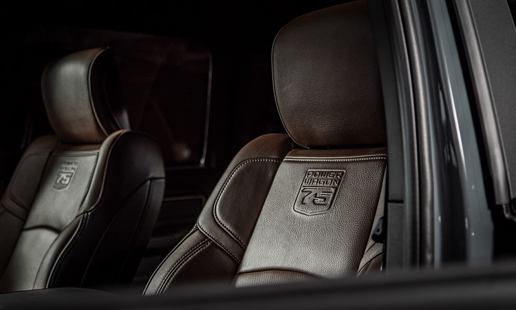 前排標準兩張運動座椅,棕色的皮革內飾並看得到Power Wagon 75的專屬銘牌,中控台採用黑色皮革待配上亮黑色飾板,中間12吋多功能顯示幕,所有功能都由此介面操作,另外影音娛樂系統配上Harman Kardon揚聲器,對於皮卡來說絕對是最大享受。另外,螢幕裡的功能還包括360度環景、越野模式調整、顯示車身越野狀態等。