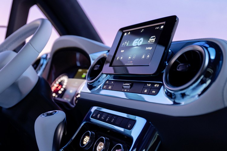 車身長度4,945mm的廂型車,兩側都採用電動側滑門,相當大的開啟面積,讓乘客可以輕鬆自如進入到第三排,從照片中可發現M-Benz大膽使用白色做為車內nappa 真皮座椅顏色,除了座椅之外,方向盤、中控台、排檔桿都為nappa 白色真皮。車內如果忽略圓形通風口和中控台周圍閃亮藍色飾板,其實EQT內裝與一般M-Bnez沒有太大差異,畢竟這輛車的定位並非最頂級的EQS或者S-Class。車內影音配備標準搭載MBUX資訊娛樂軟體,可用聲控做任何功能切換,這已成為品牌中任何車款標準配備。
