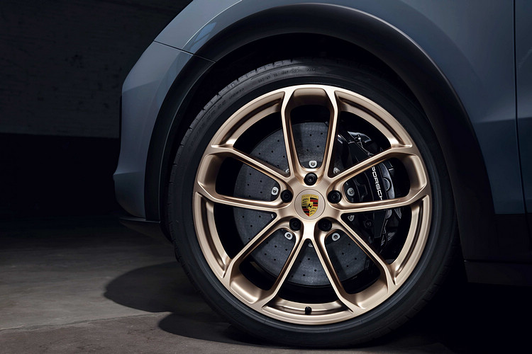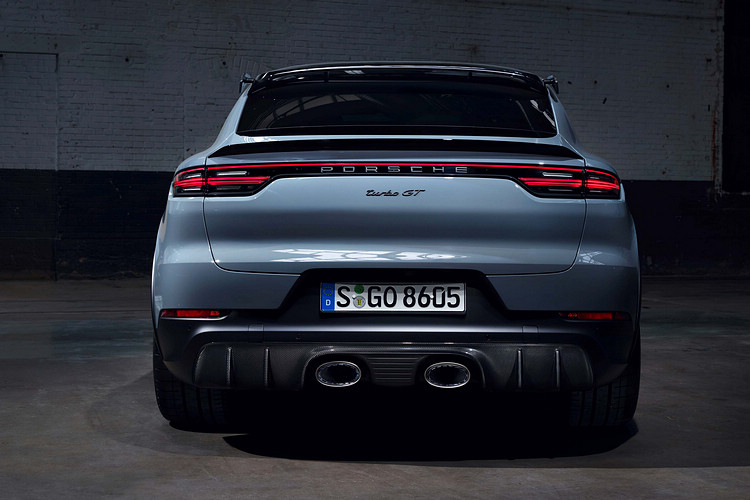 Cayenne Turbo GT配置專屬的前保險桿、外觀醒目的前擾流板,以及擴大的側邊冷卻進氣孔。碳纖維形塑出的車頂輪廓,霧面黑色輪拱造型搭配22吋 GT Design輪圈施以釹銀色烤漆。同樣是GT專屬的還有縱向安裝於車頂擾流板上的碳纖維側板,後擾流尾翼尺寸亦較Turbo車款搭增加25mm,這樣的設計足以讓車輛於極速行駛時,再增加達40kg下壓力,而碳纖維製成的後下擾流板也增添車尾的跑格。
