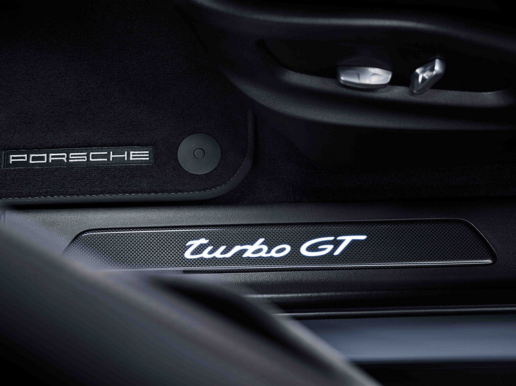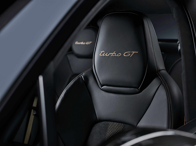 內裝以Alcantara麂皮為主要材質,雙前座八向電動調整跑車座椅以及跑車化雙後座系統為標配,座椅皆採GT專屬設計,中央椅面採用Alcantara麂皮包覆,頭枕施以turbo GT字樣,釹銀或冰極灰色更襯運動氣息。