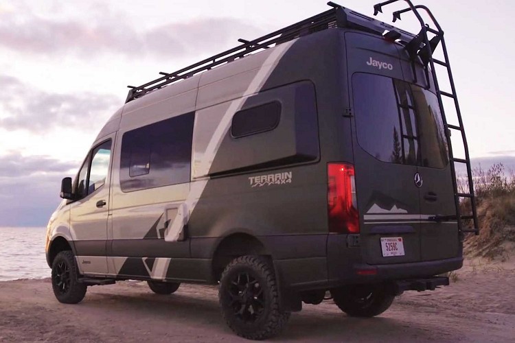 這輛名為Jayco Terrain的露營車,是以Mercedes-Benz Sprinter 2500 4x4為基礎所改造,車輛的軸距為3,657mm,充足的空間可以好好發揮。車內的配備應有盡有,Jayco設定可以在車內長時間生活,必須包括淋浴間和廁所。廚房部分帶有小冰箱和電磁爐以及簡易洗手台。其餘部分還有收納櫥櫃、收折桌子、旋轉椅子等,區分用餐、休息等需求之機能。