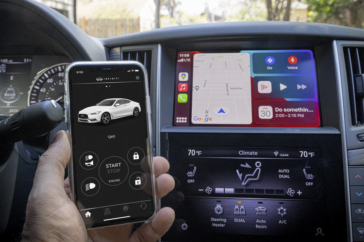 新年式Q60配備高解析度的「INFINITI InTouch」雙觸控螢幕,可提供InTouch線上服務並支援無線Apple CarPlay智慧手機整合操作平台。還可透兩個USB插孔(Type-A與Type-C)將行動裝置與「Android Auto」作業系統的資訊娛樂系統連結。