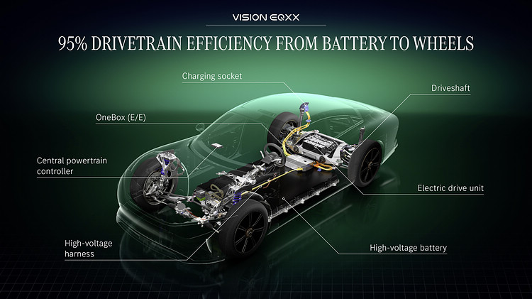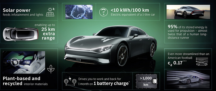 Mercedes-Benz發表一款擁有超長續航性能的VISION EQXX電動概念車,單次充電可行駛超過1000km,號稱從柏林開往巴黎的過程中不需停車充電。這款概念車從構思到完成只花了短短18個月,先進材料打造的低風阻輕量車體,結合AI神經擬態運算技術節制可能的浪費,並透過高效率的能源管理技術取代傳統的大容量電池,如以每年駕駛12,000km來計算,平均每月只需要充一次電。