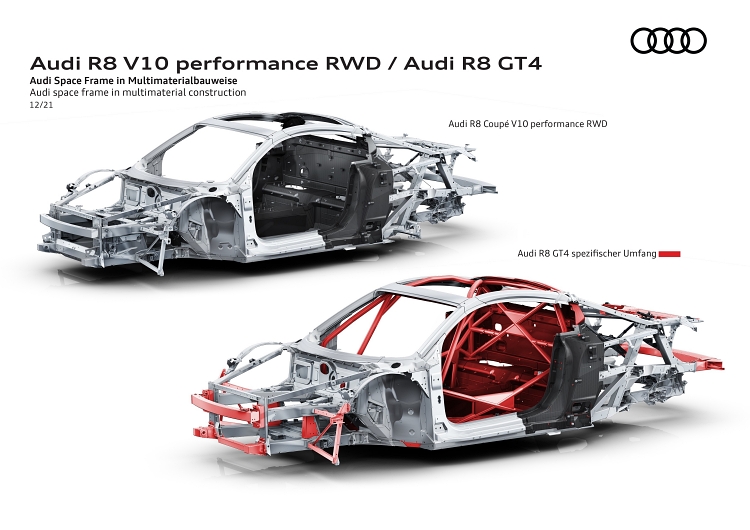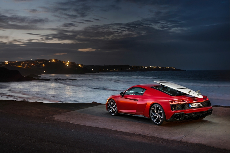 R8 V10 performance RWD所搭載的5.2升V10自然進氣汽油引擎可輸出570hp最大馬力與56.1kgm最大扭力。搭配七速Stronic手自排變速箱。所搭載的LSD會依據行駛狀況將扭力在左右輪間進行分配,碰到溼滑路況時可以有較好的循跡抓地表現。車體中大比例採用鋁合金與碳纖維強化樹脂材質將重量分別壓至Coupe硬頂車型:1590公斤、Spyder敞篷車型:1695公斤,車身前後重量比例為40比60。