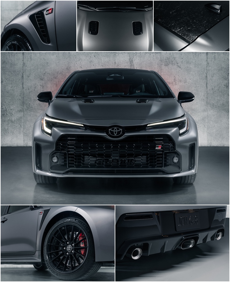 為提供更長的輪距增加操控極限,GR Corolla車身外觀進行了大幅改造及升級,最明顯的差異在於前、後輪拱比起一般Corolla Sport向外擴增60mm、85mm,車尾則是配置三排氣尾管。此外,車身結構剛性也同獲強化,車頂則是以CFRP輕量材質製成。