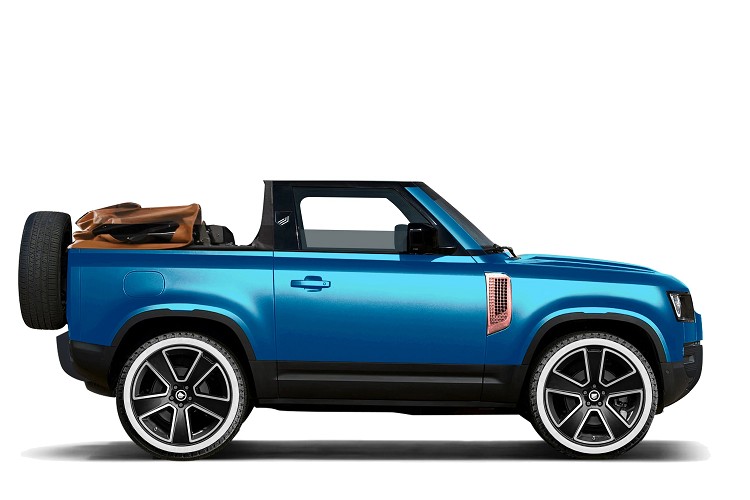 Heritage Customs於2021年底就已經想過要把Defender弄成敞篷版本,並將它命名為Valiance Defender Convertible,預計只會生產五輛,同時推出三種主題車款有Côte d'Azur、Solihull Sand 和 Kokkini Paralia。照片中看到得是Solihull Sand Valianc版本,靈感來自於英國鄉村,車身採淺綠色塗裝,帶有灰色保桿,軟質頂棚則是米色做搭配,鋁圈唯一組20吋白色鐵圈。內部則採咖啡色皮質,消費者能選擇經典造型座椅和方向盤,達到一種懷舊的吸引力。