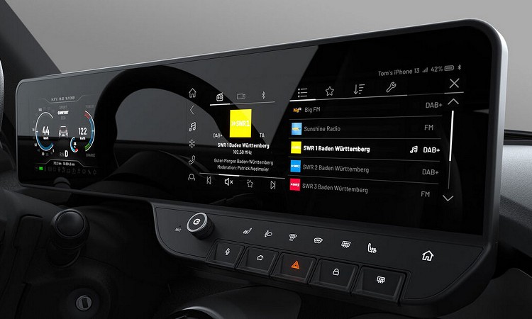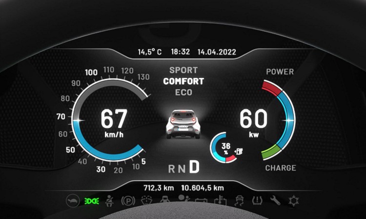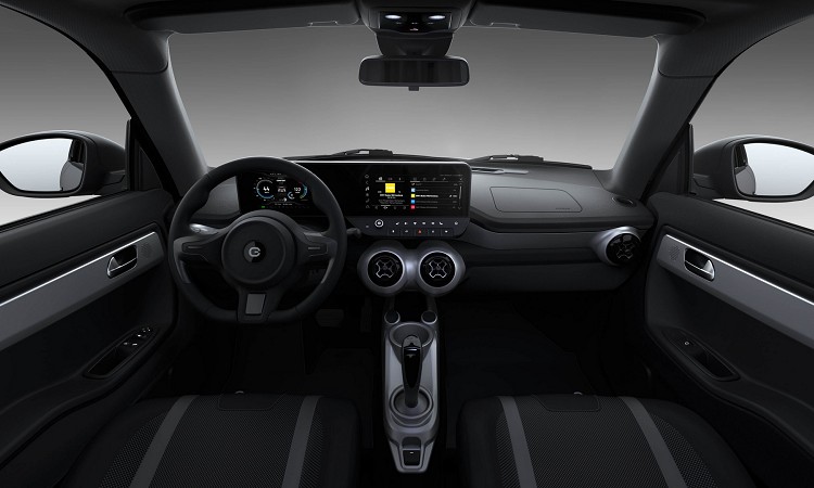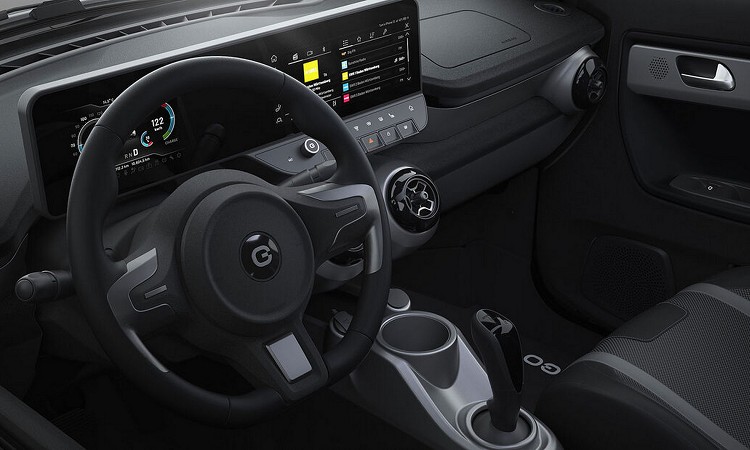 e.wave X沒有與自家任何車款共用車內造型,設計師重新對它的需求進行專屬開發,駕駛前方的儀表板和中控台螢幕結合,採用一具23吋屏幕。顯示屏幕上有數位儀表板與資訊娛樂介面,在下方還是設計快捷鍵的實體按鍵,方便操作。四座的格具配置,用了最簡單的素皮革、鋁質飾板以及塑料飾板來裝飾,整體以實用性為主。