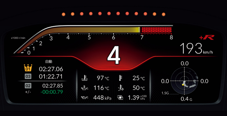 儀錶除了通常的顯示畫面外,還追加了Type R專屬的「+R mode」畫面,特別重視在賽道上激烈操駕時也能夠瞬間判讀資訊,畫面上半部的轉速錶採用計量條的設計目光不用直視就可以很直覺地判讀。檔位顯示也是大字體配置於中央非常易讀。