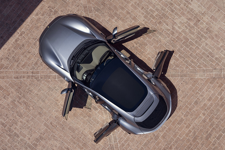 底盤是以鋁合金搭配碳纖維製成,並在關鍵部位應用高強度鋼材加以補強。與過去Ferrari的四座跑車相比,這款車尺寸更大(4973x2028x1589mm),但抗扭剛度和橫樑剛度更強,而且更輕盈(2033kg),油箱容量則高達100L。結構大量採用薄壁空心鑄件,精簡的結構組件減少焊接需求,藉此也提升整體的組裝品質。為了在降低重量的同時保有緊湊車身的特色,車門鉸鍊特別選擇位在後端,因此成為對開式開啟方式,開啟角度達到79度。