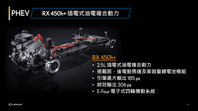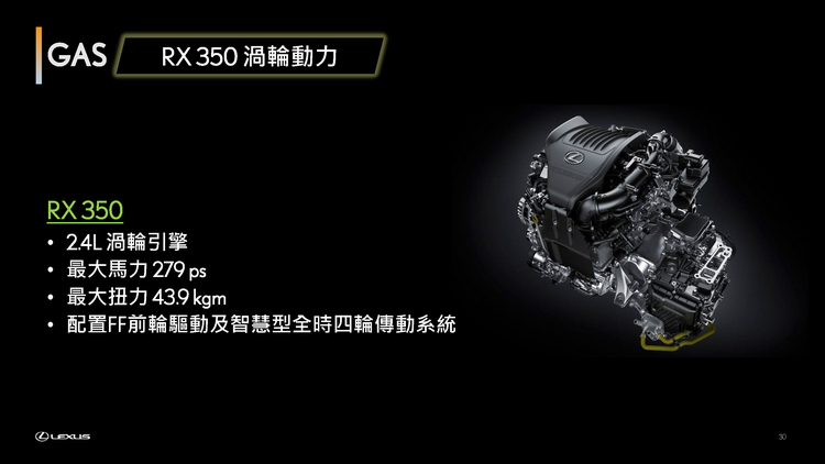 全新RX導入四款動力設定,其中三款為Electrified動力系統,展現品牌對於持續發展電動化車款之決心;其中包含搭載全新開發2.4升渦輪油電複合動力之RX 500h,可輸出達371匹綜效馬力,成為RX歷代以來最強動力之車型,搭配DIRECT 4電子式四輪傳動系統,可有效分配前、後輪輸出,提升車輛循跡穩定性,同時具備DRS後輪轉向系統,使車輛於低、中、高各種速域都能有最敏捷精準的轉向反應,打造最出色的性能與操駕表現。RX 500h將與首度導入RX車系之450h+插電式油電複合動力,以及350h油電複合動力,完整構築Electrified電動化動力陣容,提供消費者各式選擇。
