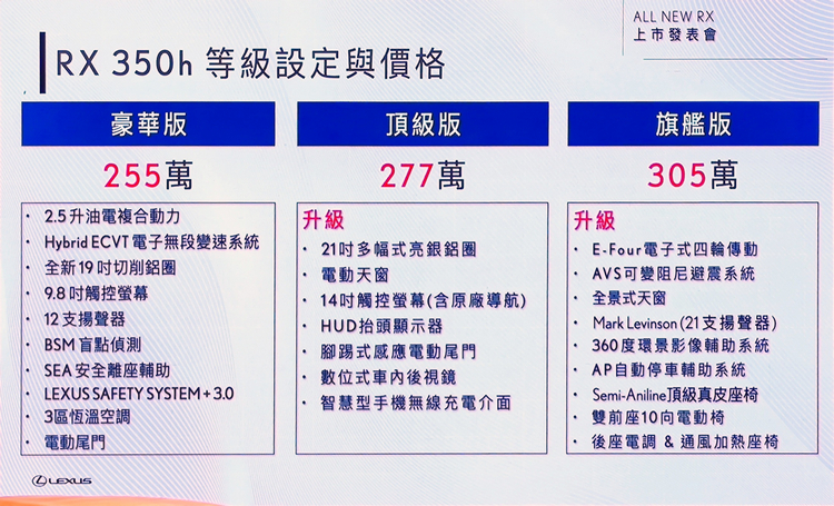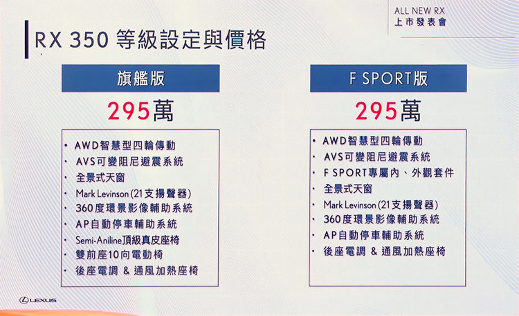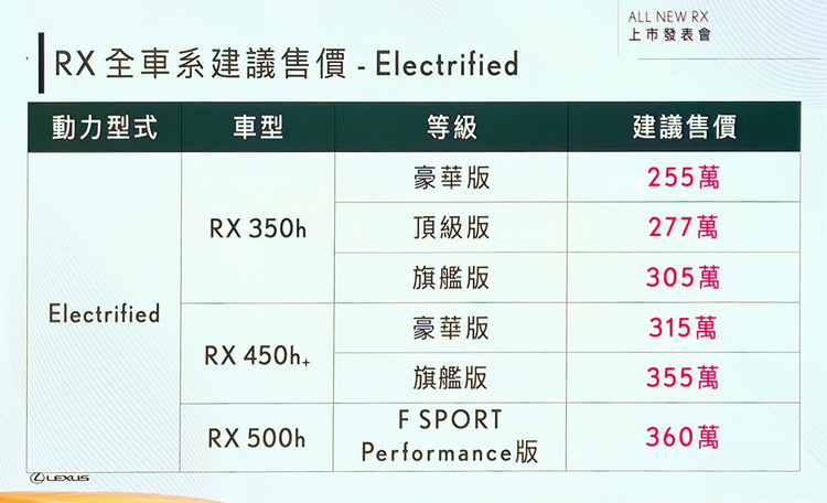 Lexus總代理和泰汽車於11月7日開始全新RX預售後,以4種動力10個等級的設定,全面攻佔豪華休旅市場,並吸引大量消費者下訂,累計訂單已破兩千張,而總代理和泰汽車也在11月23日舉辦上市發表會,並公佈正式售價。