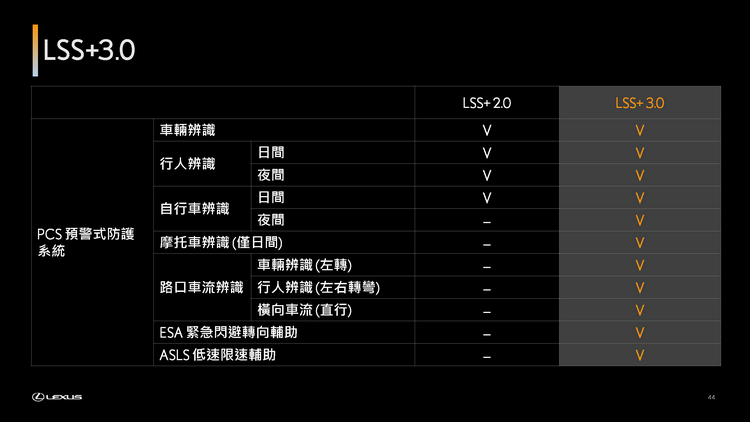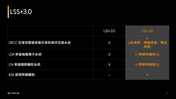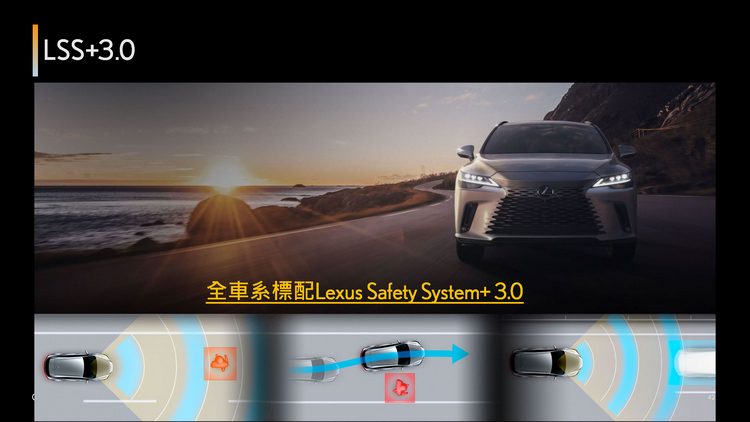 LSS+ 3.0 智動駕駛輔助系統 智於守護駕馭安全 為減輕駕駛負擔及守護車內所有乘客的安全,全新RX升級新一代LSS+ 3.0智動駕駛輔助系統,擴增多項PCS預警式防護系統功能,如路口車流辨識、緊急閃避轉向輔助及速限辨識輔助等;除此之外,DRCC、LDA、LTA等功能也再度優化,使車速控制及車道輔助更符合駕駛操作感受,降低過往系統所造成的生硬行車不適感,提供更自然與舒心的駕馭體驗。