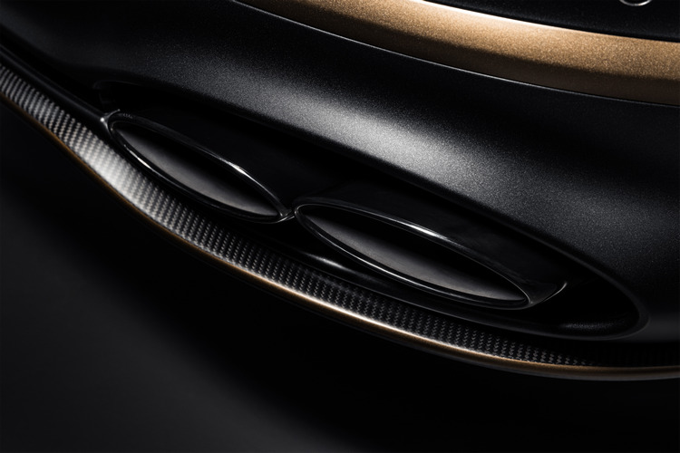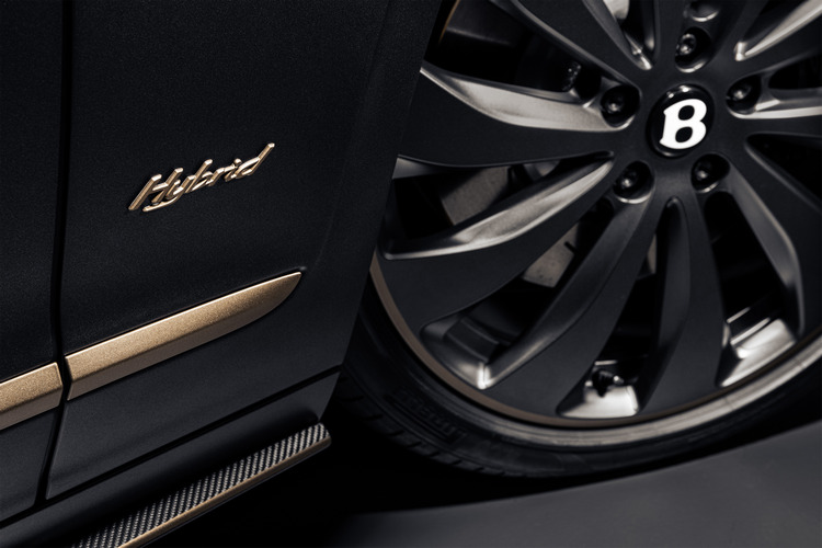 由BENTLEY客製化部門Mulliner負責操刀打造的這部單一客製車,外觀上採用無煙煤黑車色給人厚實有力的安心感,而在車頭下緣、車側護條與後保桿下方飾條等處都採用鍛面古銅色來綴飾,也可以在所配的22吋鋁圈等處看到古銅色的藝術手工繪線。還有D柱上的Surgeon徽飾與葉子板上的HYBRID徽飾也都採用相同處理。