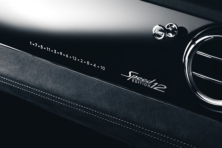 內裝比較獨特的設計,是植入Mulliner銀色滾邊並為皮椅刺上Speed Edition 12名稱,空調出風口控制裝置還看得到「12」的字樣,各部位車縫線也有對應的撞色對比配置。而在副手座前的黑色飾板上,除了嵌入專屬徽飾之外,還有一串數字,用來代表這具引擎汽缸的點火順序。