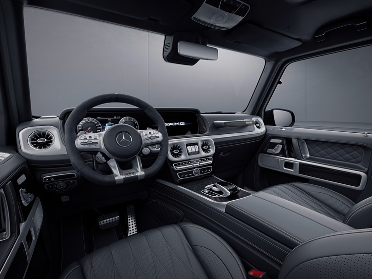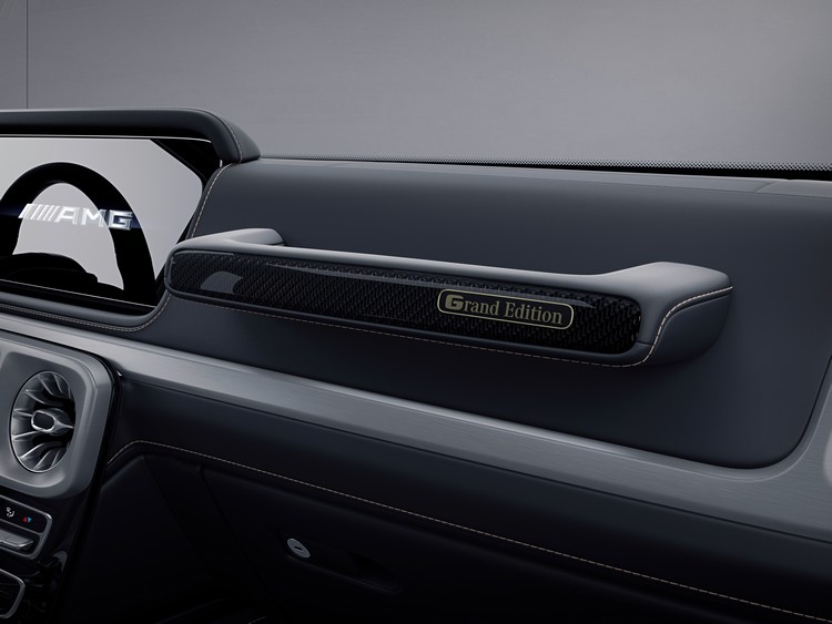 車室內則是以銀灰搭黑色調來營造視覺對比。黑色的車門檻上加入AMG徽飾;座椅配備G MANUFAKTUR的黑色Nappa真皮包覆座椅且加入金色縫線。副手座上的碳纖門把手也加入「Grand Edition」字樣。