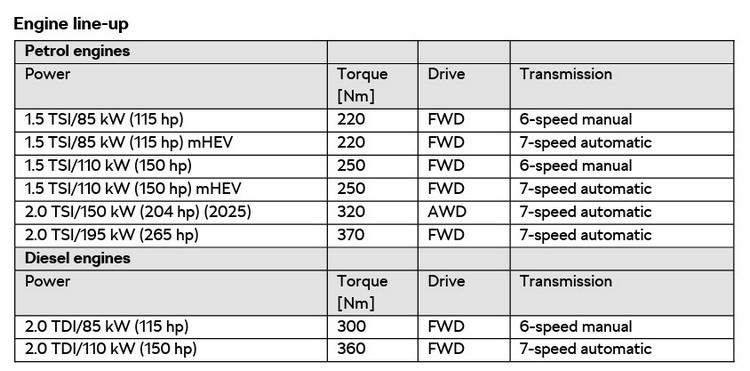 再來是2.0 TSI汽油引擎,可輸出201hp最大馬力搭配自排變速系統與四驅設定,頂規的RS車型則擁有261.5hp最大馬力搭配DSG變速系統。在柴油部分則是兩款2.0 TDI引擎,114hp最大馬力版本搭配六速手排變速箱,147.5hp最大馬力版本則搭配七速DSG。