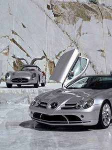 1950年代中期,三位寫下賽車歷史的顯赫人物--Juan Manuel Fangio、Stirling Moss與 Karl Kling,讓M-BENZ 300 SLR成為有史以來最成功的賽車。 這款被稱為銀箭(Silver Arrow)的300 SLR,配備排氣量2982 cc八汽缸引擎,馬力高達310匹,極速超過時速300公里,足以使其在1955年所有頂級賽車盛事中技壓群雄,一舉囊括Mille Miglia、Eifelrennen、Targa Florio、Tourist Trophy以及瑞典格蘭披治大賽(the Swedish Grand Prix)的冠軍。 當時M-BENZ轎車測試部門暨賽車研發部門的主管Rudolf Uhlenhaut (1906-1989),並進一步將這部所向無敵的賽車發展為道路版的雙門跑車--300 SLR Coupe。它融合1954年生產之300 SLR Gullwing的設計和技術,於1955年首次亮相,所到之處眾人無不目不轉睛。