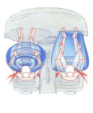![]() 這套裝備採用的是機械式操作,裝置在前座椅背的上半部,重量約一公斤左右,既不會影響裝在椅背下半部的側向氣囊,也不會妨礙到乘坐舒適性,一旦車禍發生時,前座乘客的上半身便會壓迫到椅背,此時系統立即啟動,椅背內的一套槓桿系統會將頭枕向前上方位拉扯(向上20mm、向前60mm),如此就迅速縮短頭部和頭枕間的距離,避免頭部撞擊頭枕產生巨輻震盪後的二次傷害。