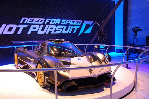 今年度的E3 Expo活動上,EA設置碩大的展示舞台,中間停放一輛造型誇張的Pagani Zonda N1賽車相當搶眼。在電子遊戲展陳列跑車目的,無非是替賽車遊戲宣傳,由EA主導的Need for Speed系列口碑盛傳,本年度最佳力作就是集結各家超跑得Hot Pursuit,讓玩家體驗當警察或地下飆車嫌犯的滋味。