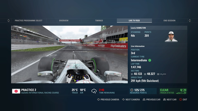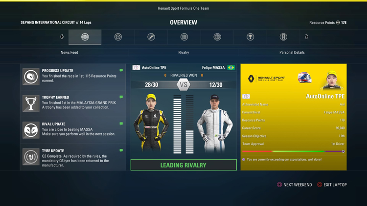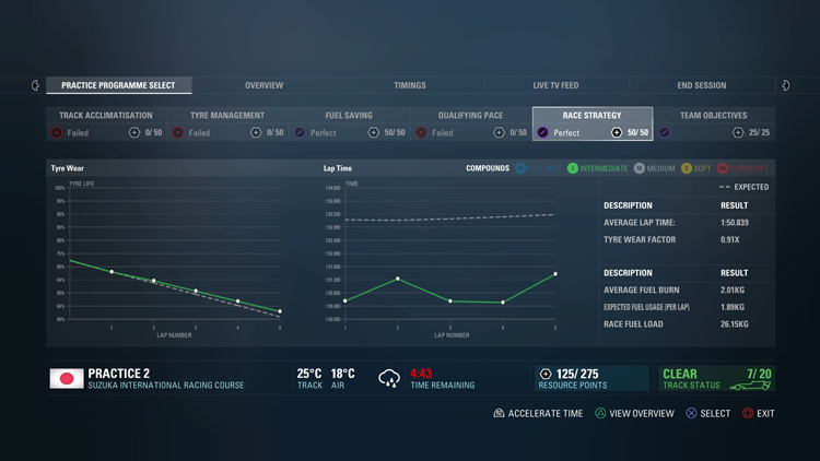 既然車輛升級需要資源點數,那這些點數究竟從哪來呢?答案很簡單,就是從自由練習、排位賽與正賽中獲得。而「練習計畫」就是在自由練習中相當重要一個資源點數獲取來源。玩家可以在每場賽事的三個自由練習過程中參與「Track Acclimatisation」、「Tyre Management」、「Fuel Saving」、「Qualifying Pace」以及「Race Strategy」等五項練習計畫,這不僅能讓玩家對賽道與車輛狀況更加了解,同時在完成所有的練習目標後就可以獲得資源點數。至於排位賽與正賽,雖然不像自由練習有練習計畫,但在這兩個接段遊戲仍會為玩家設定目標,達成目標後仍會獲得點數。除此之外,生涯模式中還新增經典賽車邀請賽,玩家會在正規賽事的區間受邀參與競賽,同樣的完成賽事後玩家也會得到資源點數。