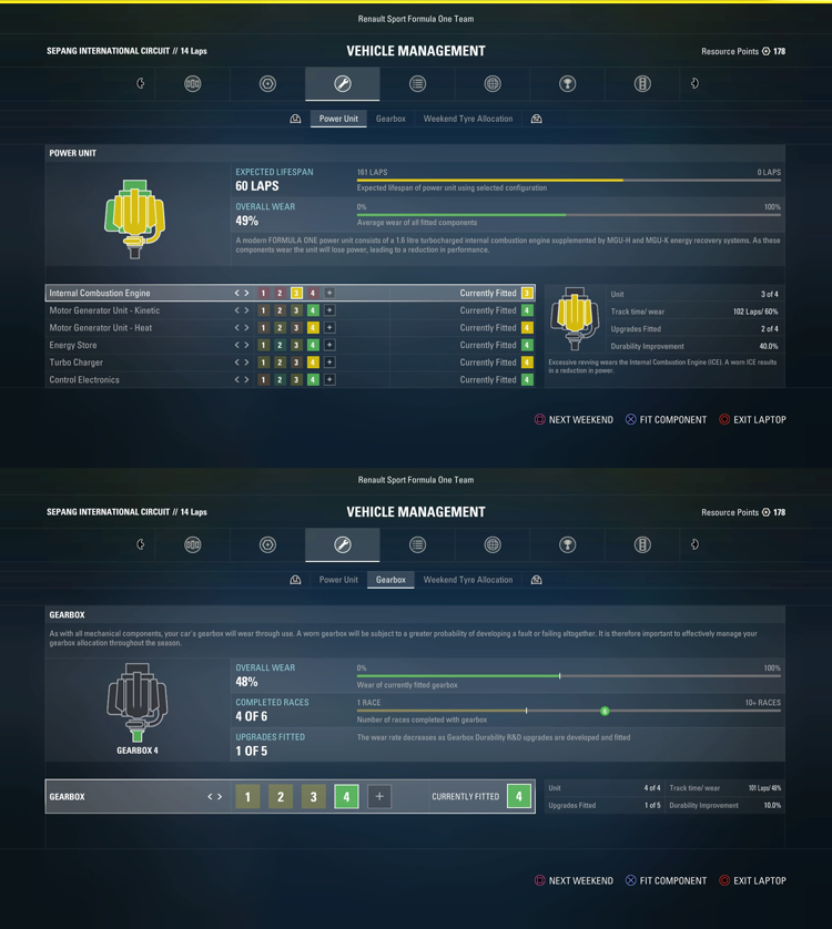 完賽率是賽車最重要的一環,在《F1™ 2017》遊戲的生涯模式中ICE、MGU-K、MGU-H、Energy Store、Turbo Charger與Control Electronics共計六項動力元件與變速箱都是會損壞的,損壞的速率與現實相當,即使玩家選擇較短的單站賽事,車損的速度也會按比例更動。判罰部分則與正式比賽相當,當玩家在分站賽事中更換賽車元件或是超過賽季可用額度,就會依照競賽規則進行退位判罰,玩家如果希望在生涯模式中獲得好成績,維持賽車元件的良率是相當重要的課題。
