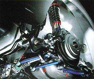 避震器![]() 具有Hi-Low Kit及筒身可調設計,可做車身高度調整及彈簧作動行程調整,十足競技風格。減震筒衰退力五段可調,1∼2段為一般道路使用,3∼4段為彎道取向,第5段為運動性能設定。車身高度調整範圍大,前-65㎜∼0㎜,後-70㎜∼0㎜,彈簧磅數可選配,依照一般道路使用情況,基本設定為前8㎏後5㎏,兼顧舒適性與操控性。避震器上端有專為麥花臣式懸吊機構所設計的可調整式魚眼上座,外傾角可調整。