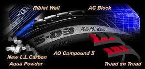 至於配方自然也與過去的S-02系列不同,新胎採用了「 AQ Compound II」 化合物 ,主要是抑制輪胎橡膠因過度使用;或環境變化而導致硬化,原廠在S-03配方中便加入「特殊軟化劑」來阻止粒子重組,以加強輪胎之磨耗壽命。曾經在GRID Ⅱ出現的Dual Layer Tread II技術,擁有輪胎損耗達50、70﹪仍擁有卓越抓地性能之特色,在S-03中也加入了這項技術,如此一來在玩家使用S-03高度磨耗條件下,仍能擁有幾近顛峰的性能水準。當然其他還包括了 Super L.L. Carbon 及 Z 粒子等,這種種新穎設計不僅讓S-03可延續之前S-02乾濕地操控兼具的優勢,尤其運用多項新技術後,S-03在濕地表現和輪胎耐磨性方面,更有了較過去產品更顯著的進步幅度。