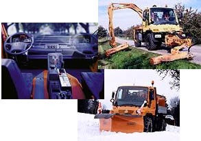 ![]() ▲Unimog可依用途不同加裝套件(圖左為可移動方向盤與踏板的VarioPilot裝置)這一次Unimog 的改款是DAIMLER-CHRYSLER合併後的第一次,而美方也提供了不少技術上的協助;新的Unimog除了提升了駕駛艙的舒適度外,一向享有盛名的全時四輪驅動系統及更加環保的柴油引擎都是全新Unimog的標準配備,而這一次的改款最大的變革就是"可調式駕駛座",由於這類特種車輛工作環境極為險峻特殊,因此固定在單邊的駕駛人視野難免受限,全新Unimog採用了"VarioPilot"的技術,在極短的時間內就可以把方向盤跟踏板移到原先的助手席,讓駕駛在執行特殊任務時能更加輕鬆,由此也可以看見Unimog為了因應多變的工作環境所做的彈性設計。