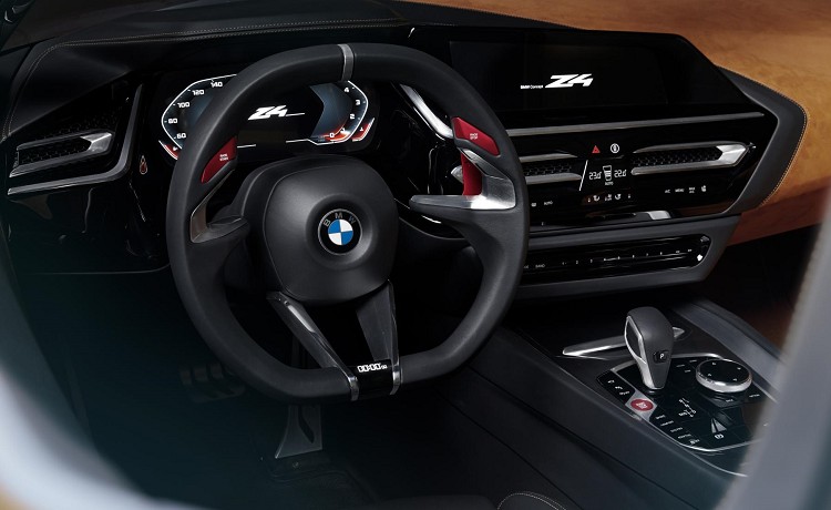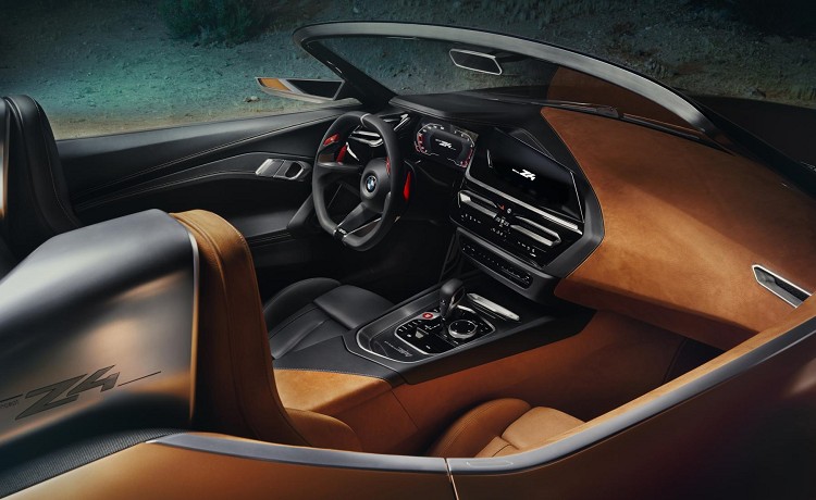 Z4 Concept的內裝看起來非常接近市售車樣貌,大型的中央屏幕配合中央鞍座上旋鈕操作,據說也將整合手勢及語音控制。單獨的冷氣介面安置在屏幕下方,依舊保持傳統按鍵沒有被觸控螢幕取代。駕駛者前方有全螢幕的數位儀表,這已經是近幾年新車上的標準配備,變化性優於傳統指針儀表板。方向盤有點類似賽車上所使用的大凹造型,後方火紅的換檔撥片為車內帶來熱血氛圍。