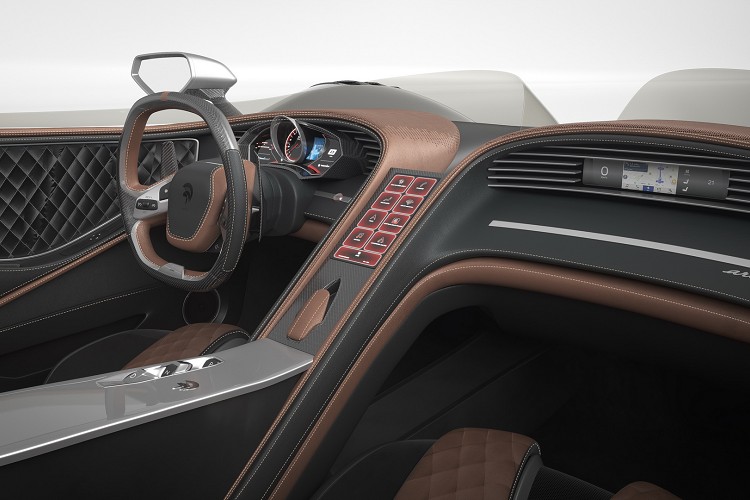 訂製內裝有著相當強烈的設計感,大量使用高檔皮革以及霧銀飾板,點綴車內強烈未來氛圍。控制按鍵簡化於造型特殊中控台,排檔則採用按鍵方式操作,儀錶板多功能顯示幕,轉速表至中帶來最佳辨識度;碳纖維材質方向盤,後方大面積換檔撥片,激烈駕駛時也能輕易操作。經過Ares Design改造之後,這絕對是Corvette內裝最有質感的一次。