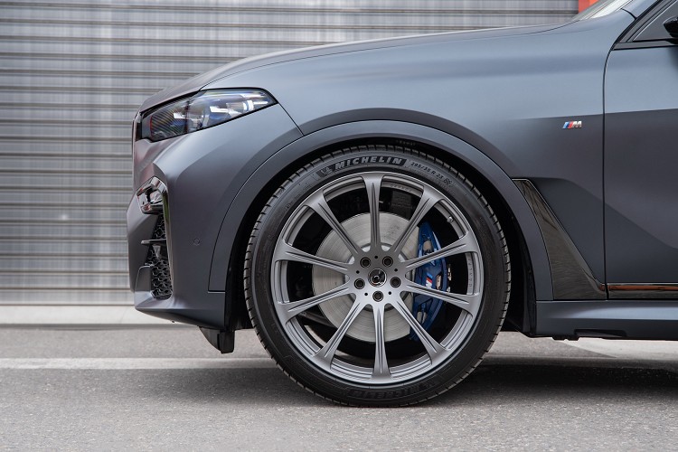 車尾對應升級後的動力,換上左右雙出尾管,幫助車輛有順暢的排氣,也可以改變排氣聲浪。此外,空氣懸吊的電腦模組調整後,車輛可以降低離地只有幾毫米,改善了大休旅車重心,使車輛更具有運動姿態。車輪換上23吋的超大尺寸,前輪295/35R23,後輪則為285/35R23,車輛動態表現能穩穩黏在地上。